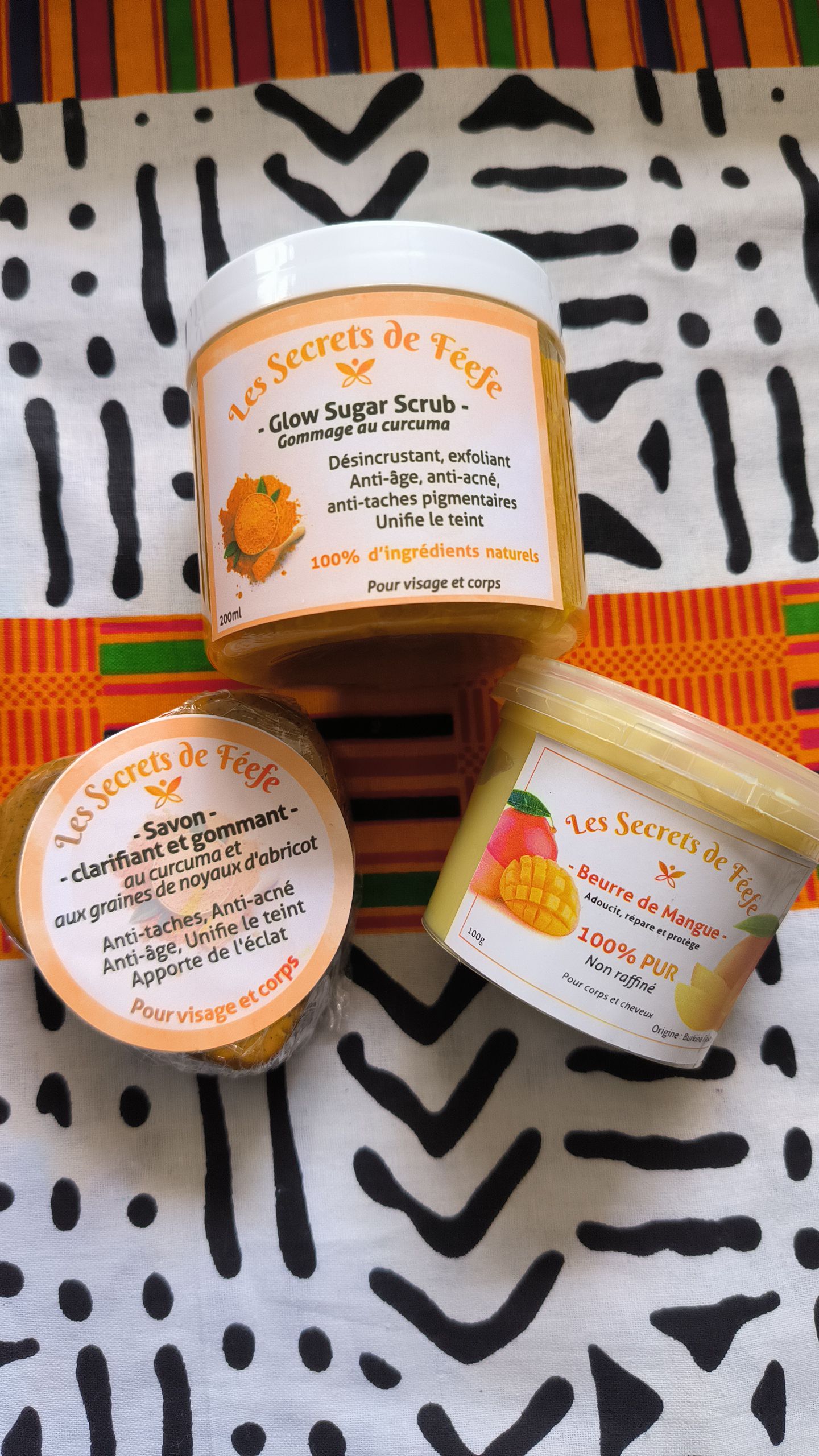 J’ai acheté cette gamme récemment, ayant un visage avec des tâches et quelques boutons. Je suis réticente à utiliser de nouveaux produits. Mais j’ai été agréablement surprise par l’efficacité, du savon et du gommage. Le gommage curcuma est très efficace malgré sa couleur, il ne tache pas. Je suis également agréablement, surprise par le beurre de mangue qui est très efficace, je l’utilise aussi pour pour mes cheveux, il rend les cheveux Afro très soyeux.